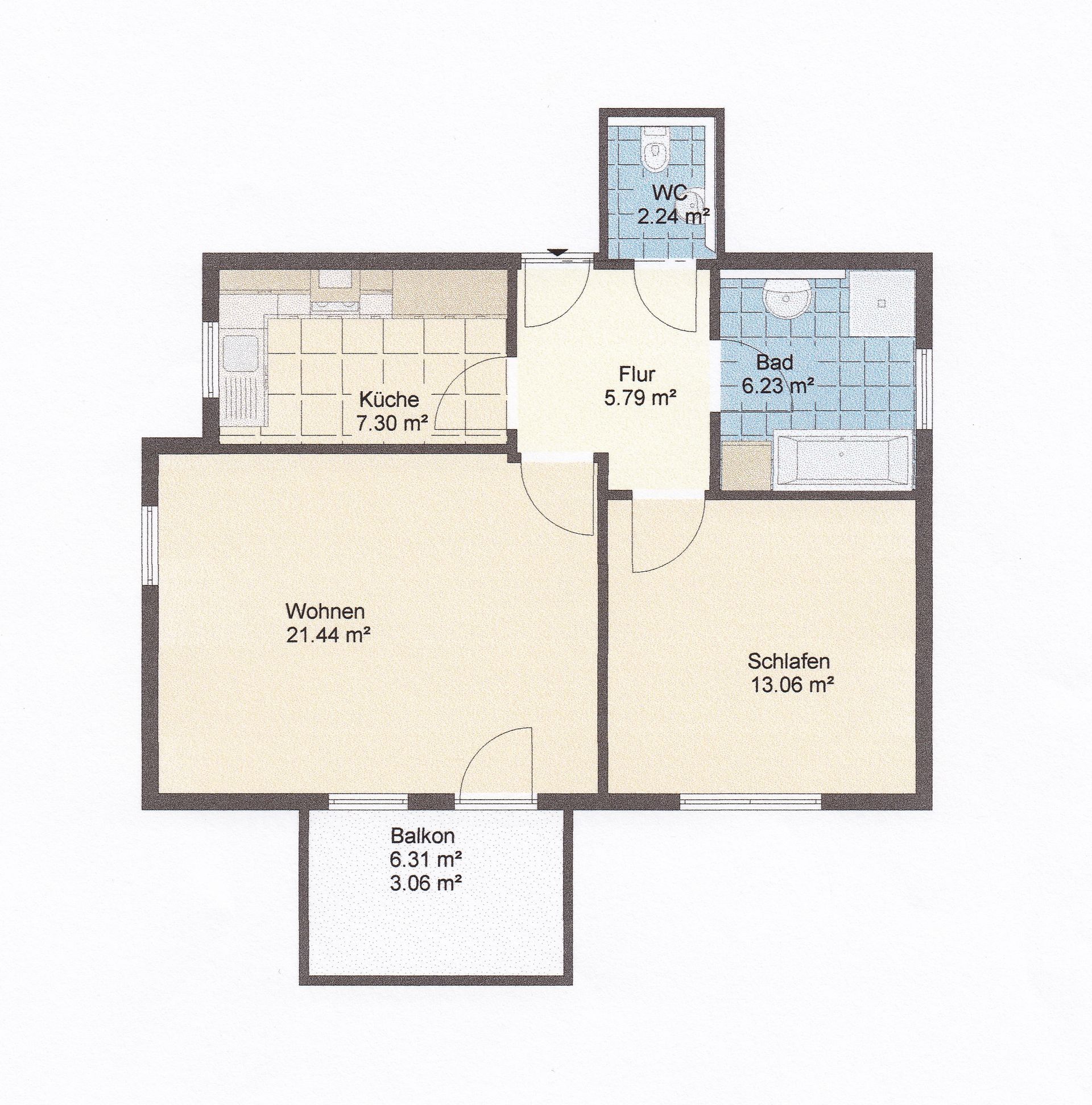 Zum Verkauf steht eine gepflegte 2 Raum Wohnung - ca 60 m² - mit Balkon, massivem Kellerraum und Tiefgaragenstellplatz im 1. Obergeschoß.
